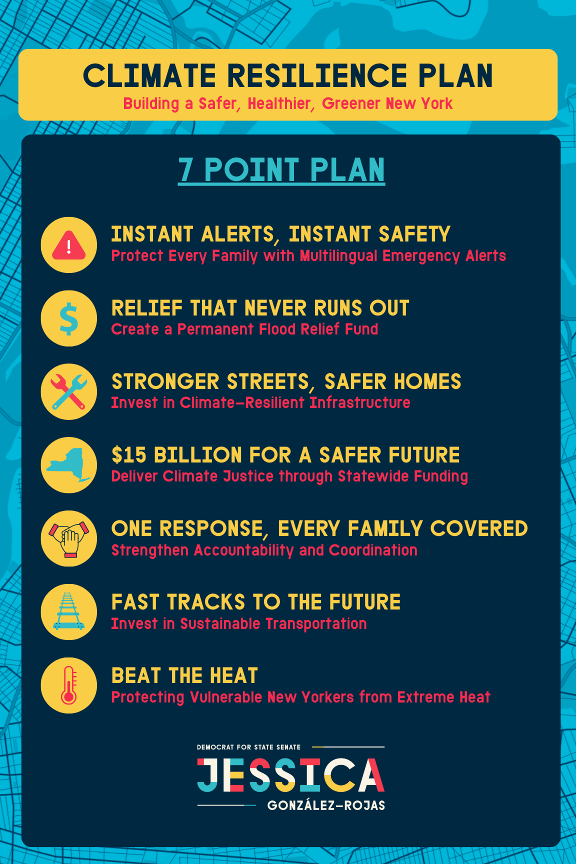 This Seven-Point Climate Resilience Plan lays out the path forward: a plan rooted in justice, collaboration, and the belief that every family deserves safety, dignity, and a future we can count on. With a collaborative, people-first approach, I will work in the State Senate to transform crisis into resilience and build a Queens that is safe, sustainable, and prepared for the future.
